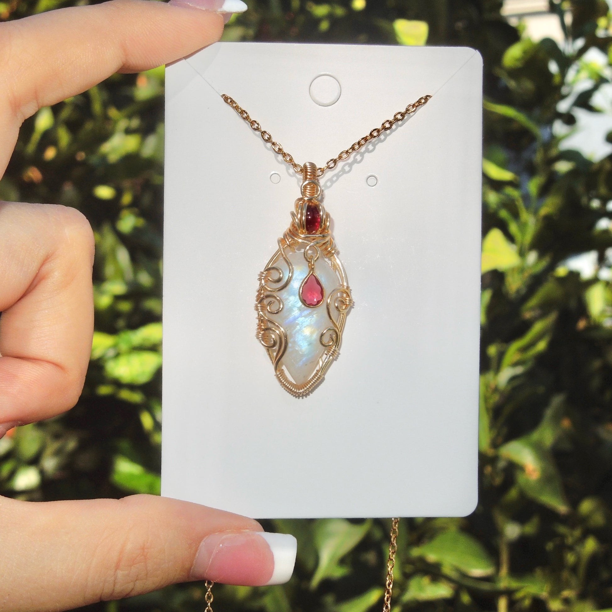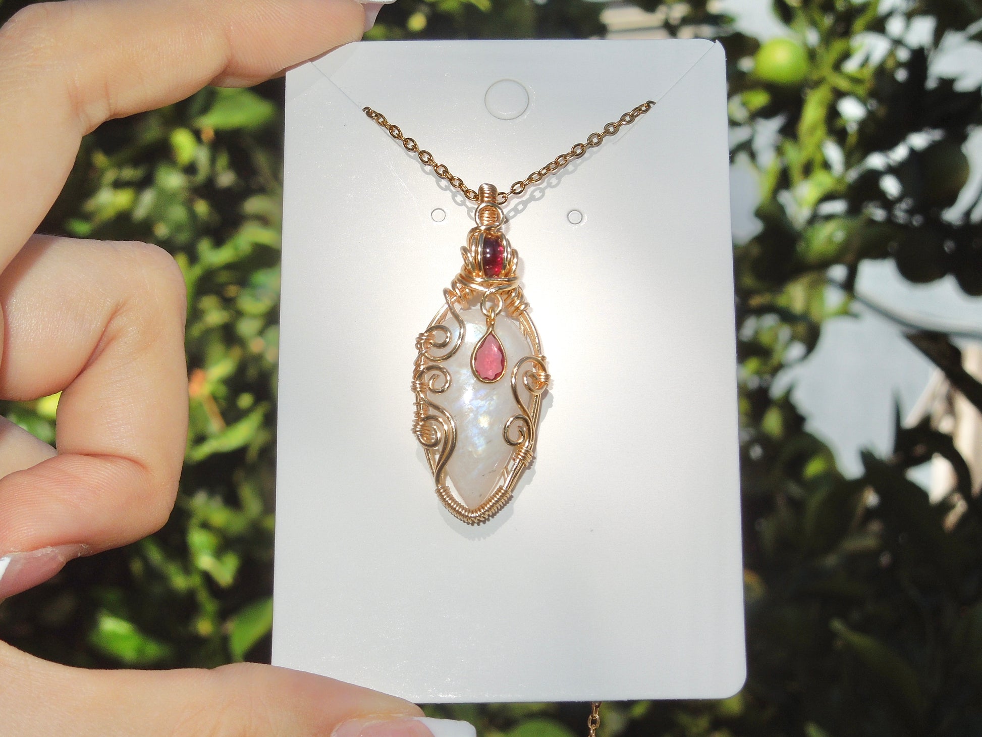 Made with Moonstone, Garnet, & a pink Tourmaline charm.